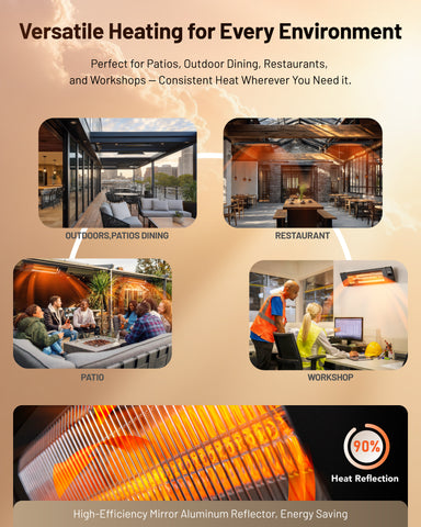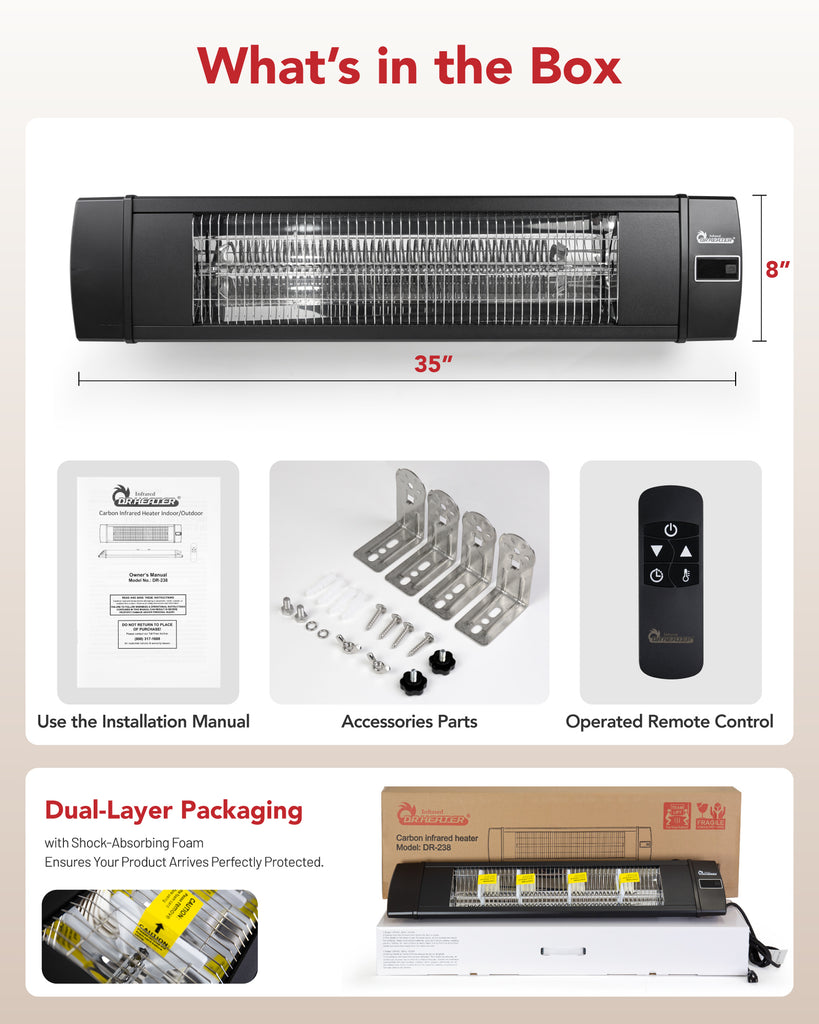 - ✔ Powerful Indoor & Outdoor Heating Solution: The Dr. Infrared Heater DR-238 is built for versatility—perfect for patios, garages, workshops, balconies, or restaurants. Whether mounted indoors or outdoors, it provides instant, consistent warmth to expand your comfort zone year-round