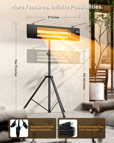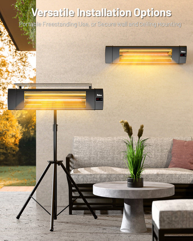 The heater includes an adjustable aluminum tripod for portable use and wall-mounting hardware for a secure, space-saving installation—giving you the freedom to set it up exactly where you need warmth.